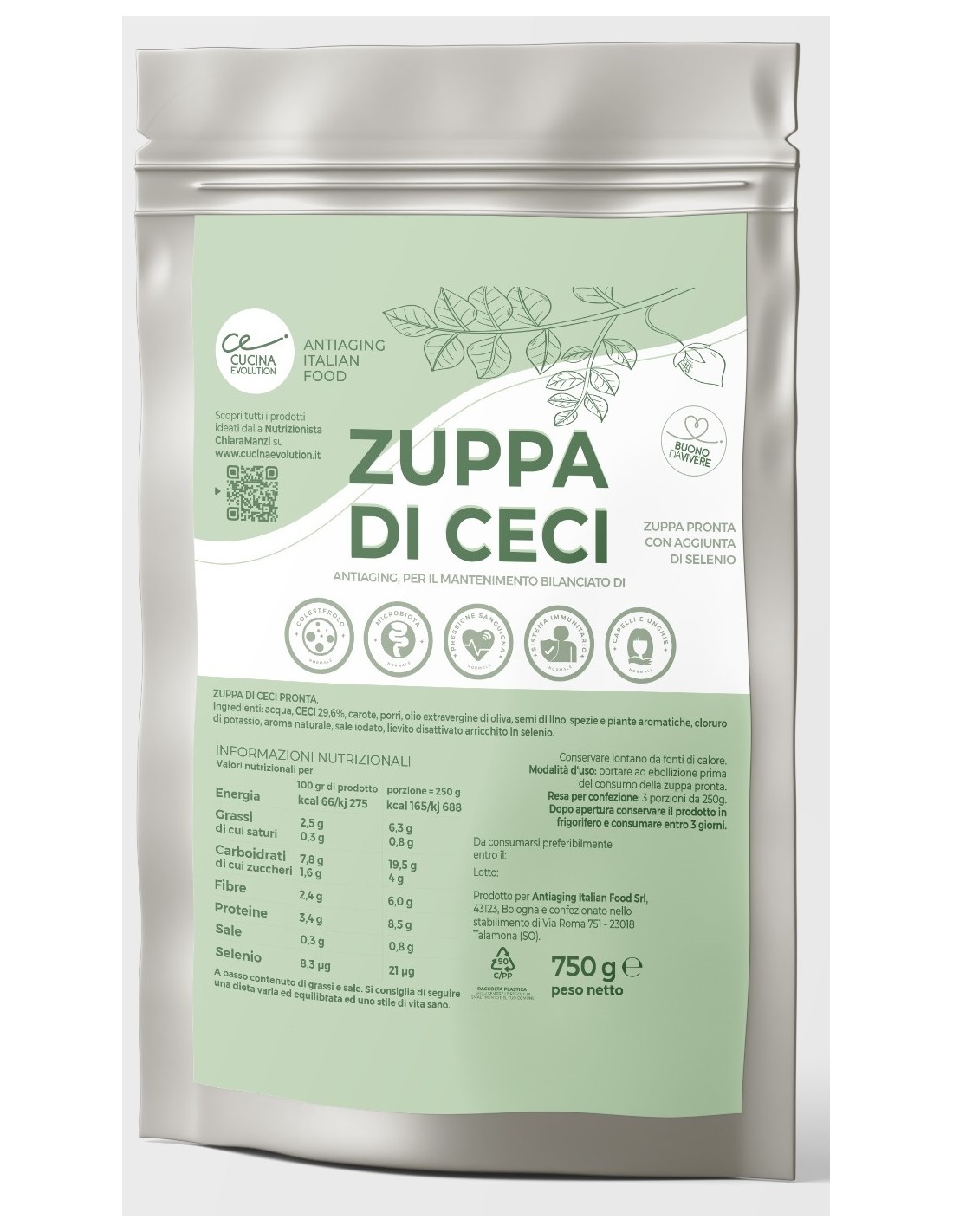 ZUPPA DI CECI PRONTA: Ingredienti: acqua, CECI 35%, cipolla, carote, porri, olio di oliva, farina di semi di lino, spezie e piante aromatiche, cloruro di potassio, aroma naturale, sale iodato (sale marino, iodato di potassio 0,005%), lievito disattivato arricchito in selenio.