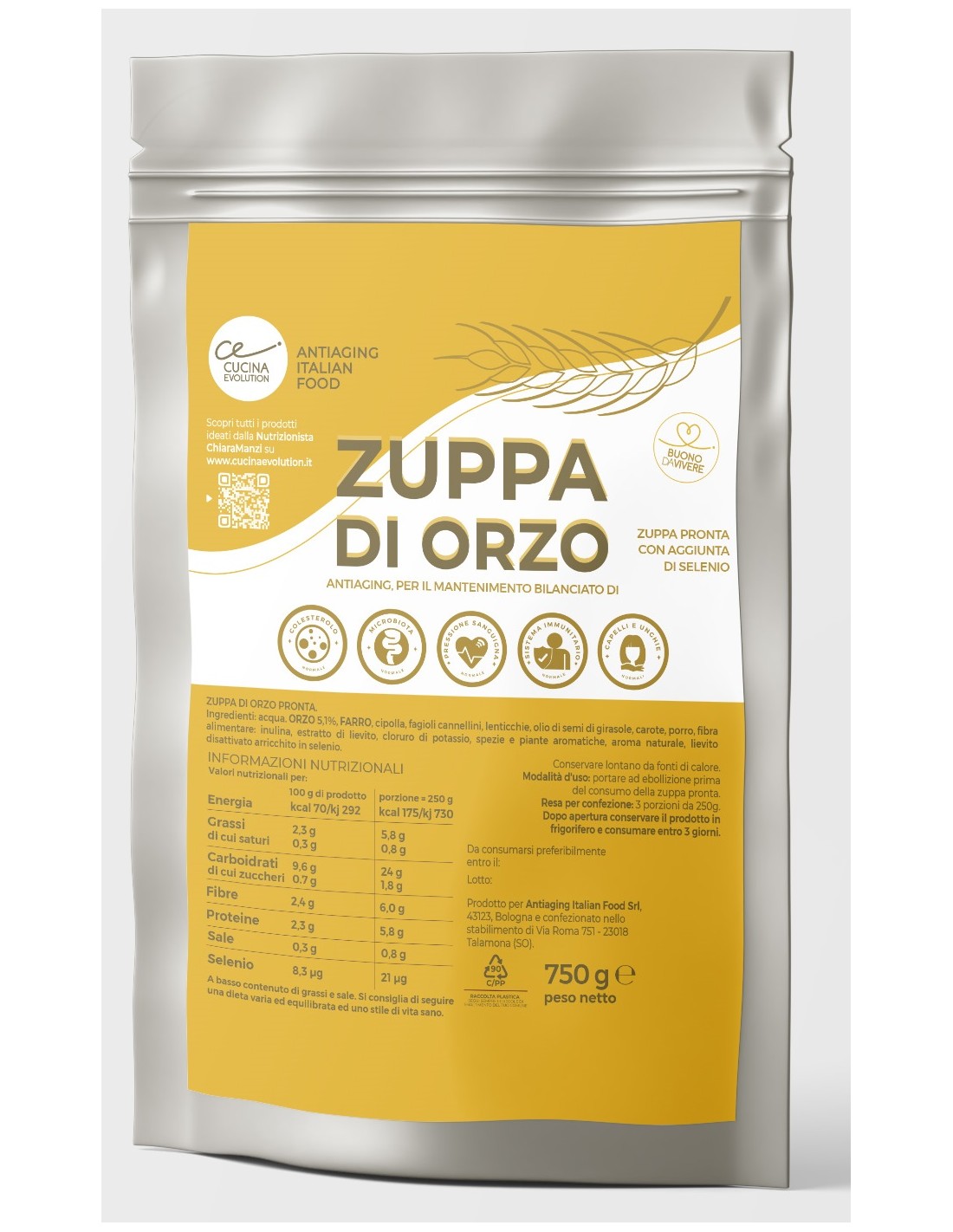 Prodotto per Antiaging Italian Food Srl, 43123, Bologna e confezionato nello stabilimento di Via Roma 751 - 23018 Talamona (SO).