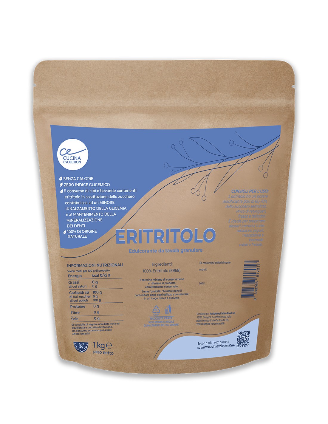 Considerando che in Europa non ci sono produttori di Eritritolo, noi di Cucina Evolution, lo facciamo analizzare attentamente per controllarne la purezza e l'assenza di additivi potenzialmente dannosi per la salute, inclusi quelli che per legge si possono dichiarare in etichetta.