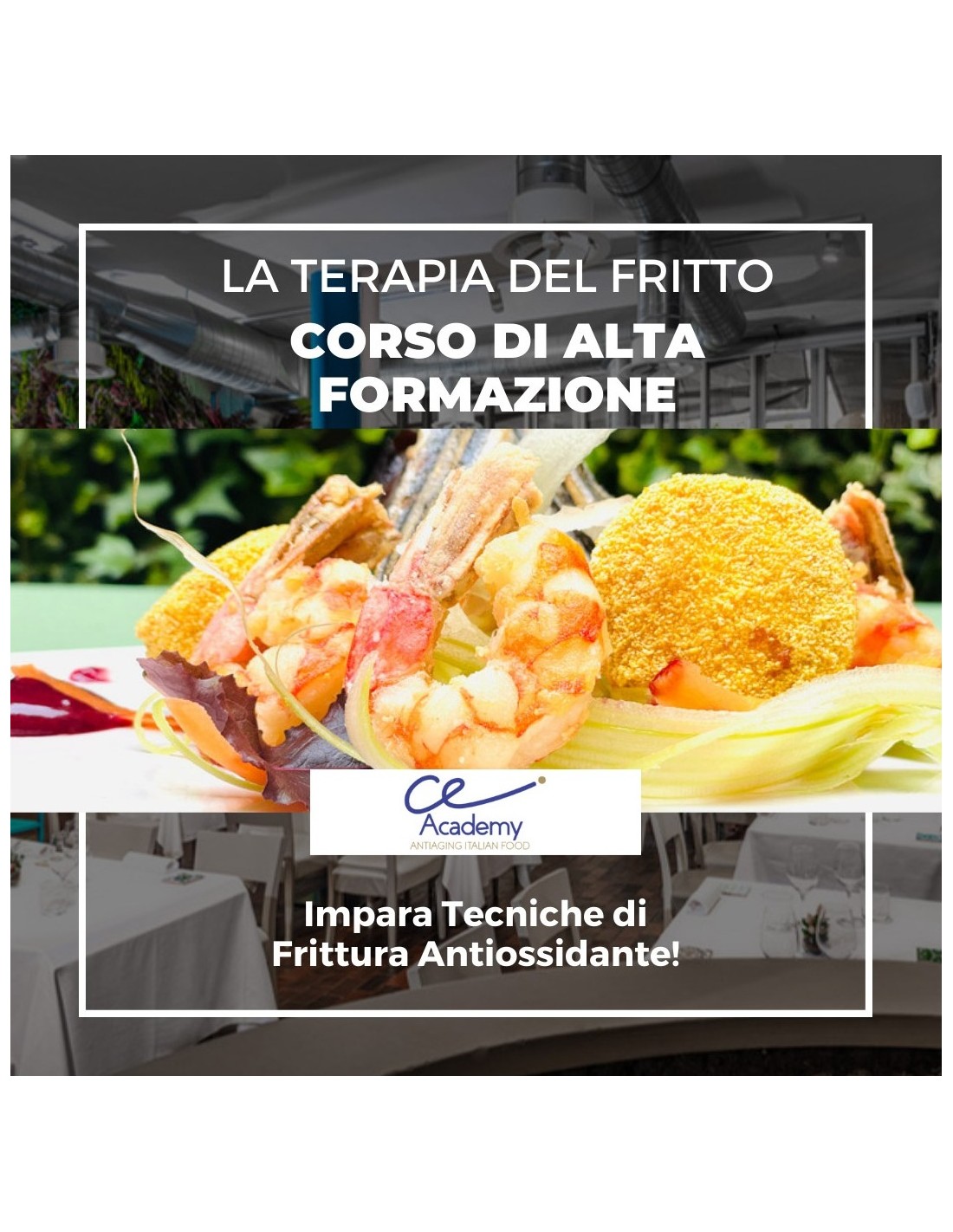 In questa giornata di Alta Formazione full immersion (10-18) imparerai la tecnica della Frittura Antiaging che aumenta gli antiossidanti e riduce l’assorimento di grassi.