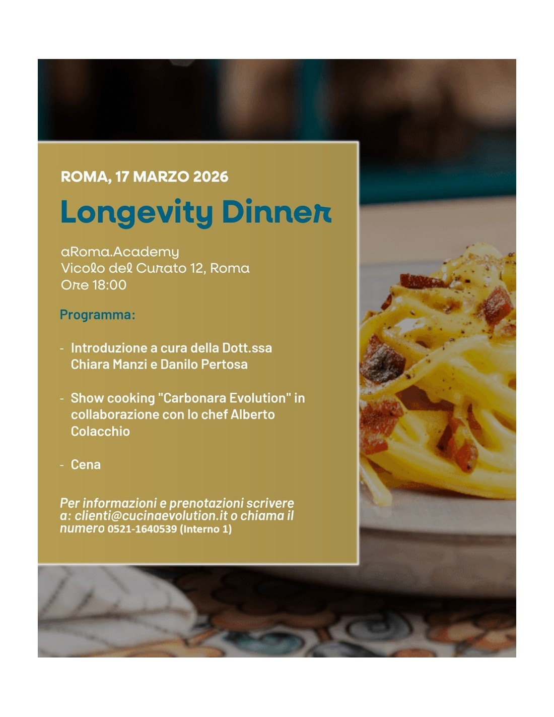 Non ci sono più articoli nel tuo carrello 17/03 - Longevity Dinner (Dott.ssa Chiara Manzi presso aRoma.Academy)
