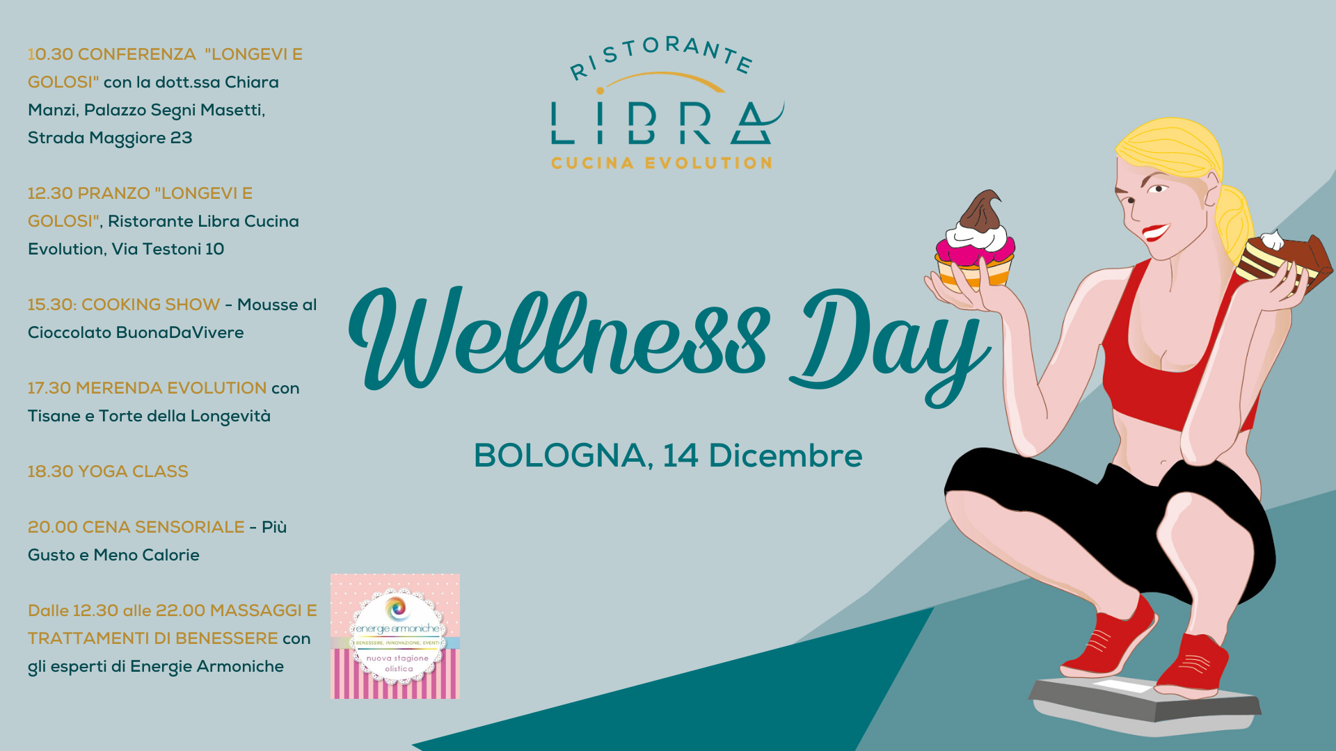 Sei goloso e vuoi rimanere in forma senza rinunce? Dimagrire mangiando dolci ti sembra un sogno irrealizzabile? Vieni a scoprire la cucina che renderà tutto questo possibile.Il 14 dicembre, LIBRA Cucina Evolution in collaborazione con CONFCOMMERCIO ASCOM ed Energie Armoniche presenta il Wellness Day, un giorno dedicato al benessere, per conoscere la cucina che permette di vivere a lungo senza dieta e senza rinunciare al gusto.Si parte alle 10.30 con la conferenza "Longevi e Golosi: la ricetta della felicità" a palazzo Segni Masetti (Strada Maggiore 23), in cui la dott.ssa Chiara Manzi intervistata dalla giornalista de Il Resto del Carlino Loredana del Ninno parlerà di come si possa vivere bene e a lungo, senza rinunciare a pasta, fritti, pizza e dolci. Cucina Evolution, il progetto di Antiaging Italian Food, è il punto di incontro fra gusto e linea.